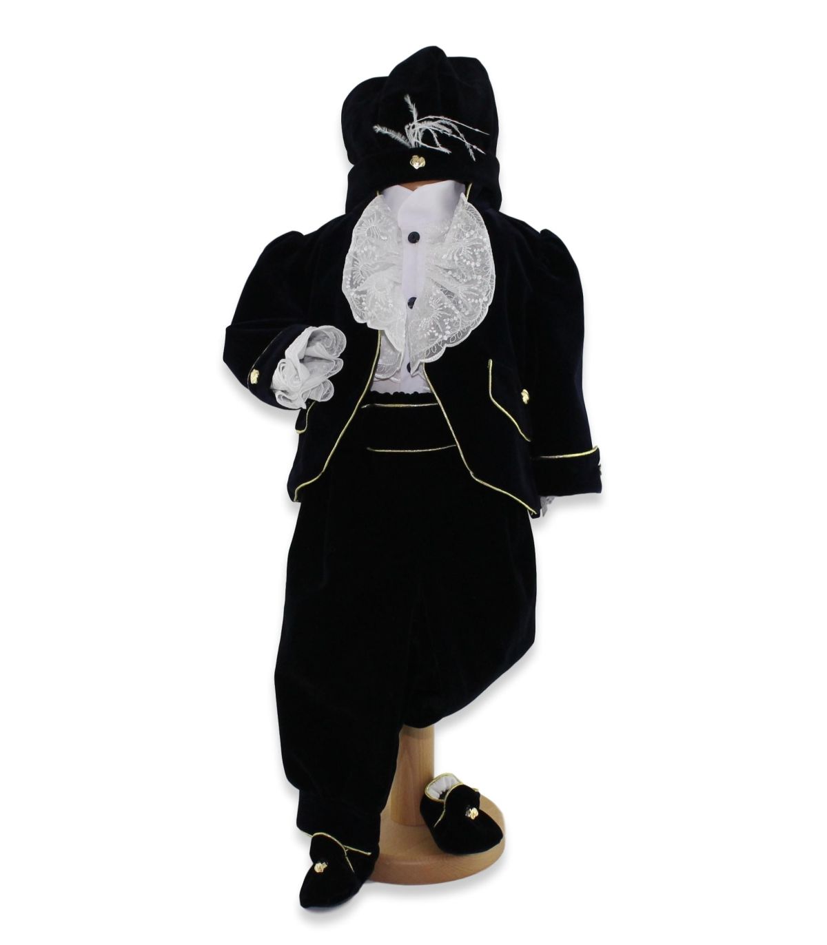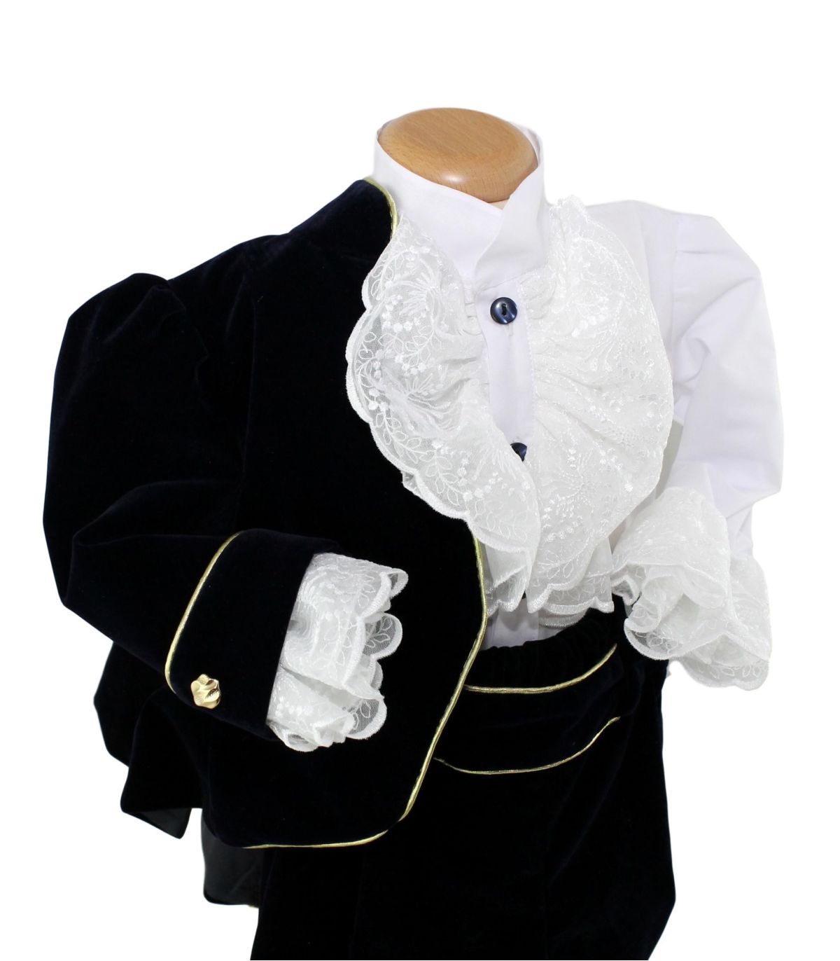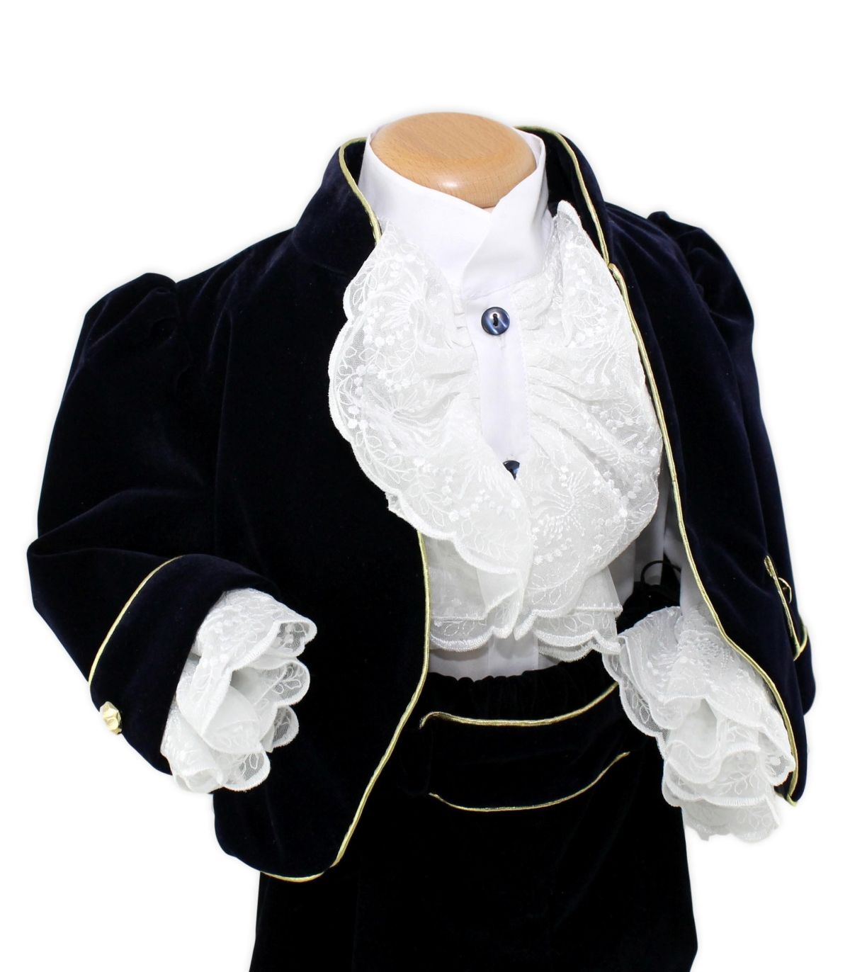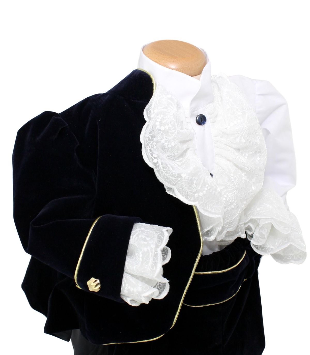 Costumasul micul print, este din catifea fina bleumarine, cu elegante accente aurii si dantela pretioasa.