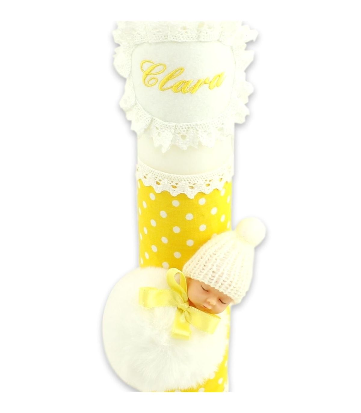 Vesele buline si-un bebelus pufos au folosit designerii AteliereleCris pentru decorarea lumanarii de botez Pufu-galben. Personalizata prin brodare si decorata cu dantela de bumbac, intr-o cromatica luminoasa este alegerea perfect pentru cei care iubesc galbenul.