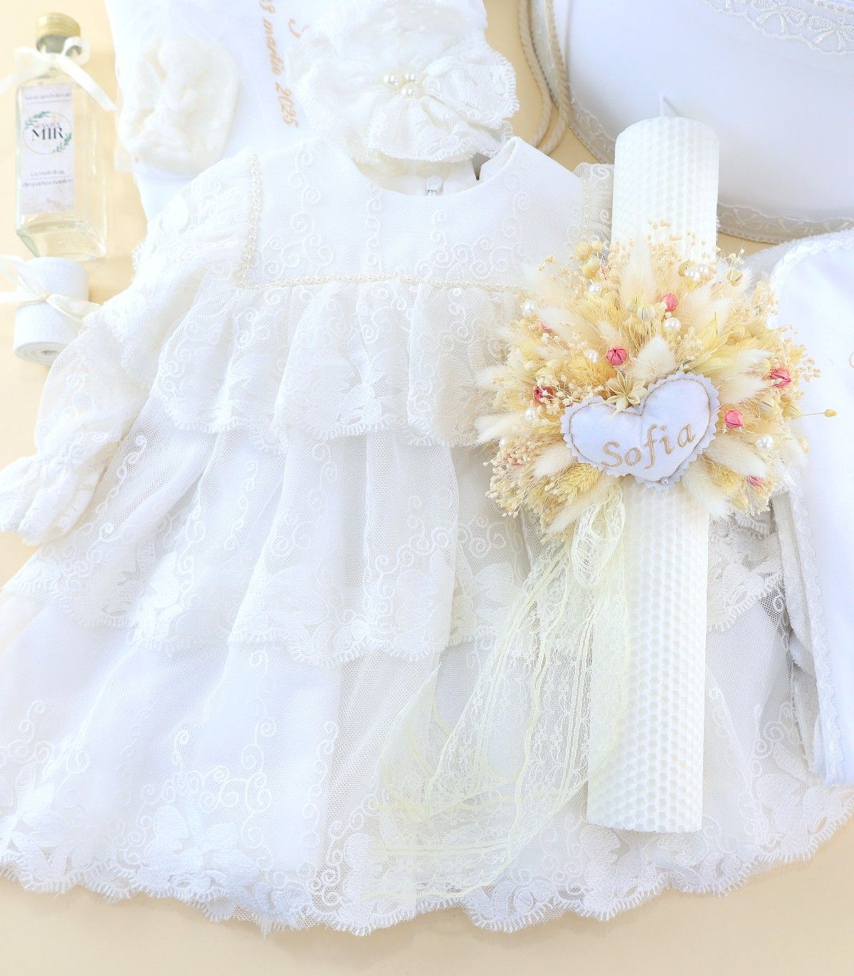 Lumânare de botez scurtă, din ceară naturală, decorată manual cu flori uscate ivoire și roz pal, spice, perle și dantelă vintage.