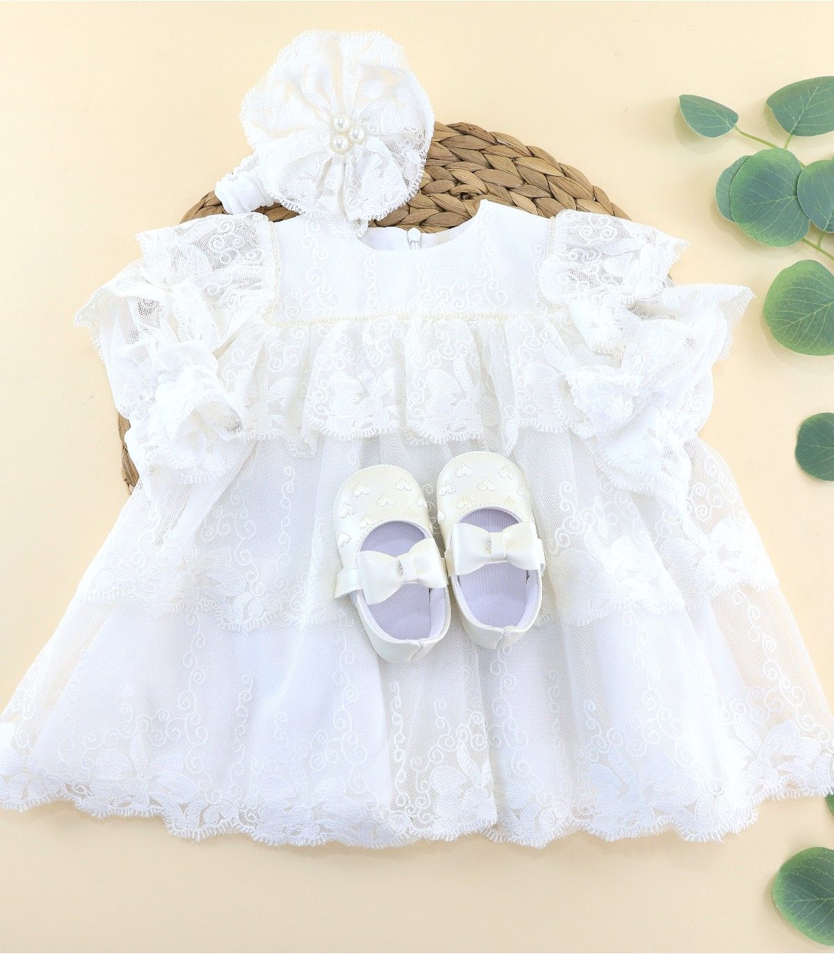 Rochiță de botez ivoire – realizată din tul brodat cu volane largi, decor floral delicat, mânecuțe bufante și închidere cu fermoar. Finisaje elegante și croială lejeră pentru confort.