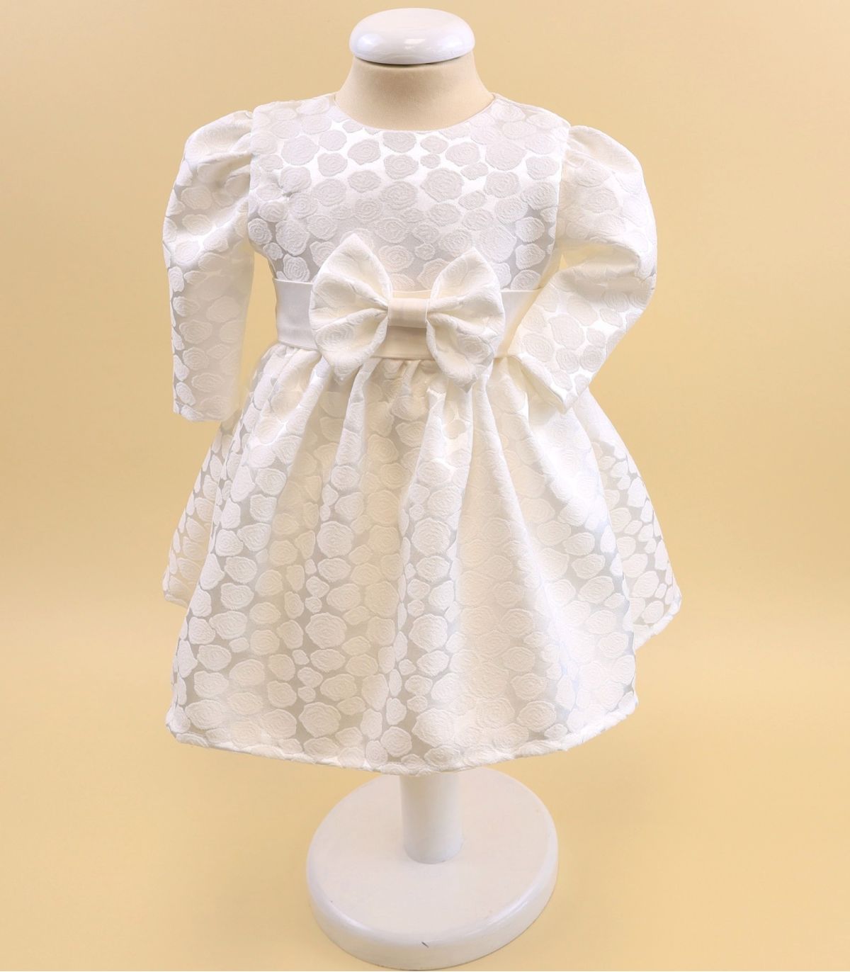 Rochita de botez, din tafta ivory cu trandafirasi catifelati. Este dublata cu panza de bumbac pentru confortul bebelusei. Este prezazuta cu fermoar lung la spate si cu o fundita reglabila in talie.